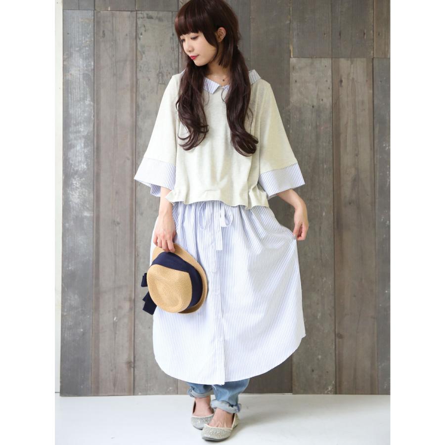 レディース ロングワンピース 重ね着風 レイヤード風 配色 ストライプ柄 七分袖 異素材ドッキングワンピース メール便不可 オシャレウォーカー 通販 Paypayモール